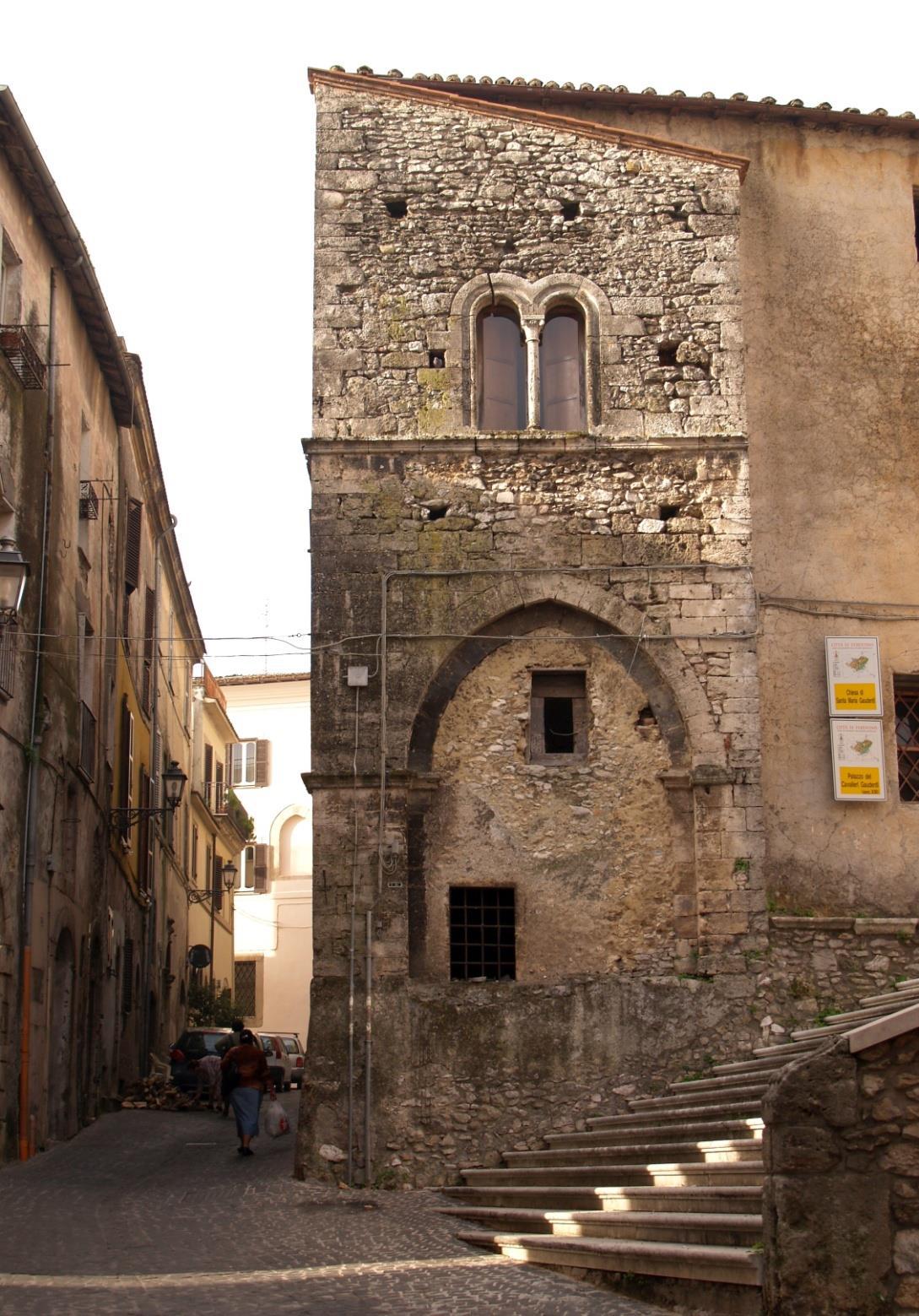 Il limitrofo Palazzetto dei Cavalieri Gaudenti fu edificato nel XIII secolo, come dimostra la facies architettonica e decorativa dell’edificio, per ospitare la Confraternita dei Fratelli di Maria Gloriosa, venuti a Ferentino, dilaniata da faide comunali tra fazioni, per riportarvi la pace. La costruzione, che si richiama ai moduli stilistici dell’arte lombarda, si ergeva in origine su un ardito porticato scandito da arcate a sesto acuto. Una serie di eleganti bifore orna la semplice facciata.