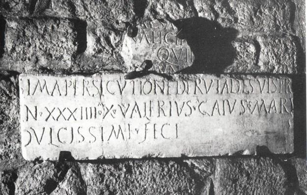 L’iscrizione, citata da Mommsen (1883), viene datata da Alfonso Bartoli (1954) ad epoca paleocristiana (IV-VI secolo d.C.). (CIL, X, 5902) La lastra mancante dell'angolo inferiore sinistro è in lettere capitali assai irregolari e trascurate. Il testo fa riferimento all'ampliamento di una basilica. (foto ICCD)