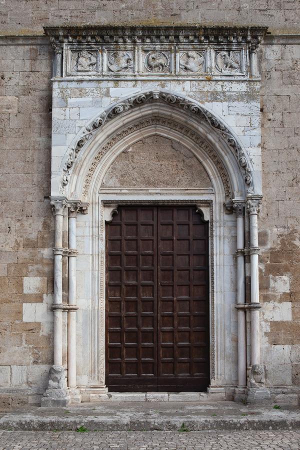 Sul quello, che si percepisce come transetto, si alza il tiburio ottagonale del campanile, incompiuto; infatti manca la guglia. Il “transetto” è delimitato da quattro pilastri polistili su base ottagonale che sostengono la sua copertura a volta a crociera. Si entra in chiesa attraverso la porta maggiore finemente decorata da un prezioso protiro con eleganti colonnine, sormontato da un attico decorato con cinque formelle con i simboli degli Evangelisti e con al centro l’agnello crucifero (Cristo). Le colonnine del pròtiro poggiano direttamente su leoni stilòfori, materiali di risulta dell’antico teatro romano, prossimo alla chiesa..jpg)