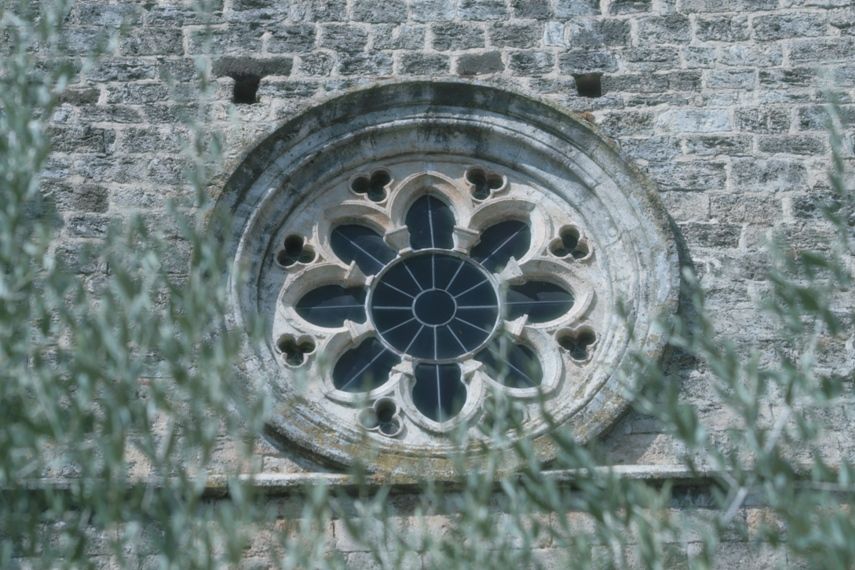 Nella facciata si aprono tre rosoni, di cui il centrale elegante e arioso nella sua metafora della Rosa dei Beati (il Paradiso).