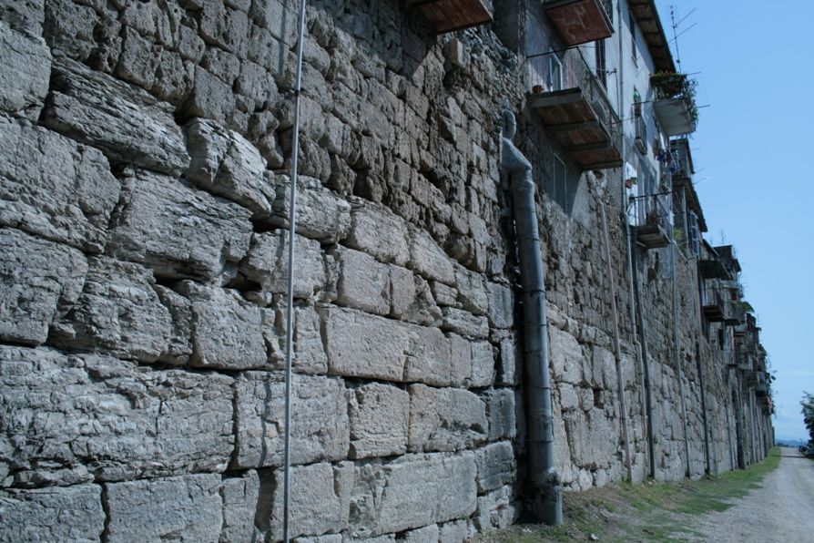 Queste grandiose mura vengono chiamate 'pelasgiche' e 'ciclopiche'. Gregorovius, infatti, le definì: "opere gigantesche frutto di una civiltà della quale non si hanno altri ricordi, ma che dovette essere straordinariamente avanzata". E continua: "Reca stupore che costruzioni di tal fattura abbiano potuto essere in parte rovinate. In molti punti quegli enormi massi sono spostati, in altri furono sostituiti con muri romani, ed altri infine si riconoscono costruzioni del medio evo... in modo che con un solo sguardo si vedono riuniti su di un piccolo tratto di muro i caratteri di tre diversi periodi di civiltà, gli uni dagli altri tanto diversi. Meglio che in qualunque altro luogo si può fare questa osservazione presso la meravigliosa Porta Sanguinaria, di struttura ciclopica che fu da prima ridotta ad arco dai Romani quindi deturpata da misere costruzioni medioevali. Le fondamenta però, sino ad una certa altezza, sono costituite da massi ciclopici voluminosi, irregolari, meravigliosamente congiunti tra loro".
